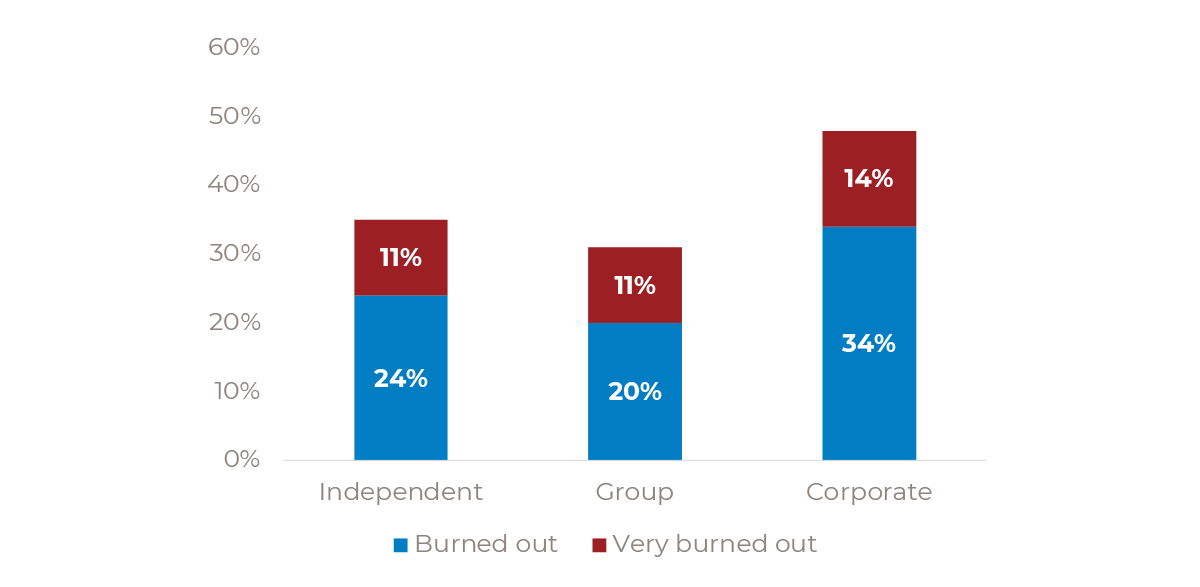 One reason for this, may be that corporate practices naturally have more head office targets, and a drive to do more with less staff, piling more pressure on those in practices. Ultimately, decision making is detached from those who work day-to-day in corporate practices.